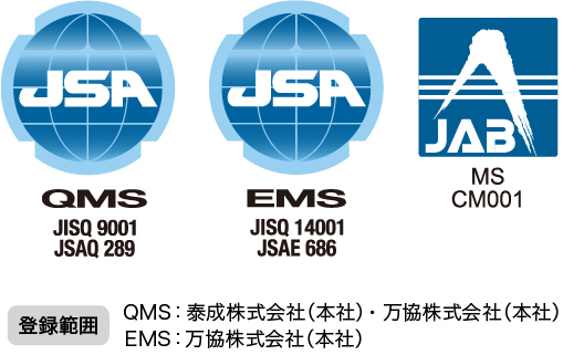 万協フロアーでは、品質マネジメントの国際規格 ISO9001ならびに、環境マネジメントの国際規格ISO14001の認証を取得。地球人として環境問題の重要性を認識し、これからの循環型社会の形成に貢献してまいります。