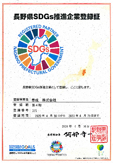 持続可能な地球・社会のために、製品・サービス、また社内改革などを通して自社ができる取り組みが多くあると考え、長野県SDGs推進企業に登録し、SDGs達成に貢献していきたいと考えています。