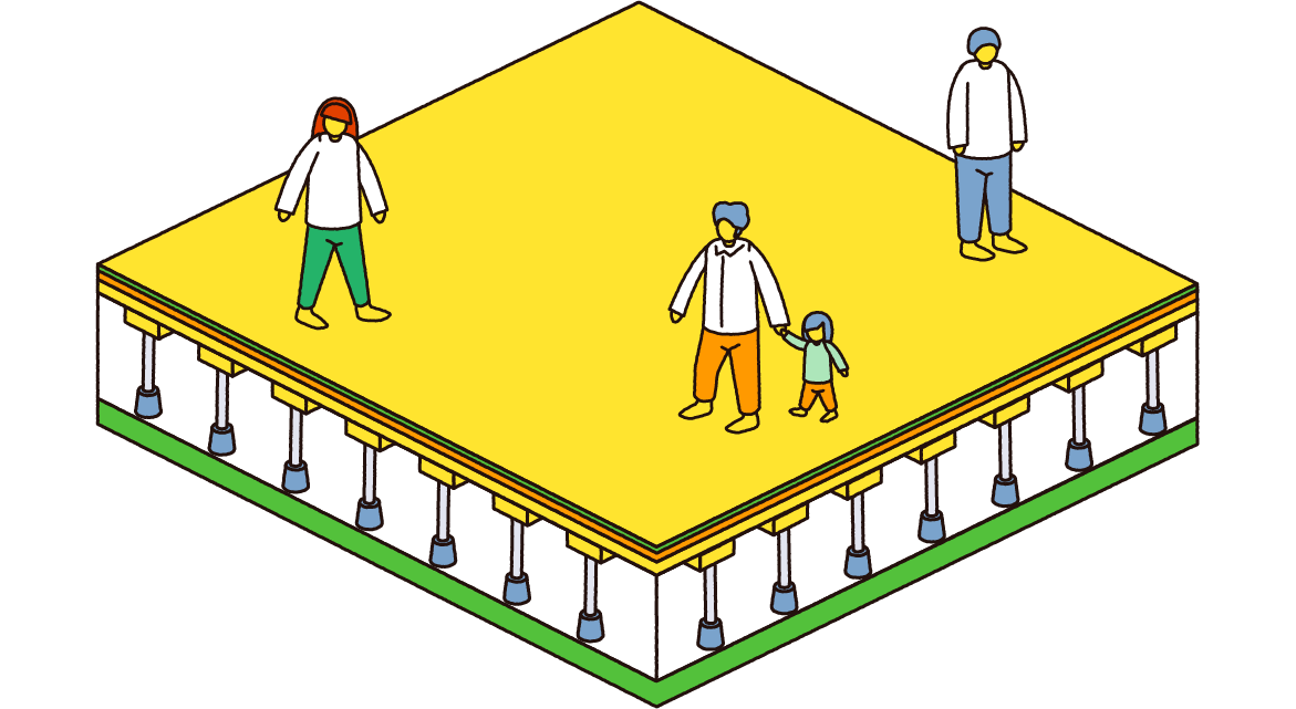 現在主流の二重床(乾式二重床)は、コンクリートスラブなどの躯体の上に防振ゴムの付いた支持脚で床を浮かせる床システムです。1960年代以降の日本における、コンクリート造の集合住宅の普及と共に誕生し、現在はマンション等を中心に多様な建築物で採用されています。未来に向けた持続可能な建築にとって、二重床は高機能な床システムとして注目を集めています。