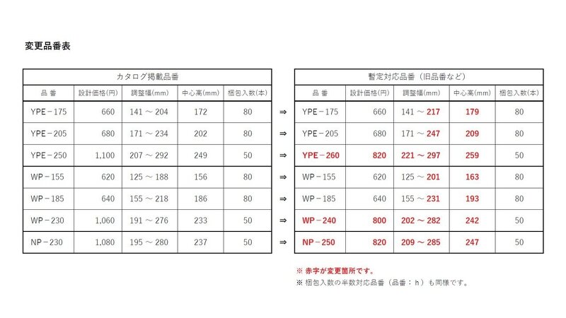 状況が改善するまでの間、下表の通り、旧品番での代替または商品の一部仕様変更で対応しております。
